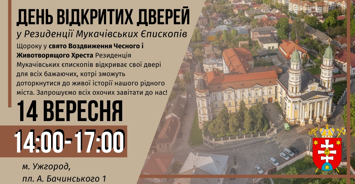 - День відкритих дверей у Резиденції Єпископа. Щороку у свято Воздвиження Чесного і Животворящого Хреста відкриває свої двері Резиденція Мукачівських єпископів для всіх бажаючих, котрі зможуть доторкнутися до живої історії нашого рідного міста. Час проведення 14:00 – 17:00, адреса: вул. Бачинського 1