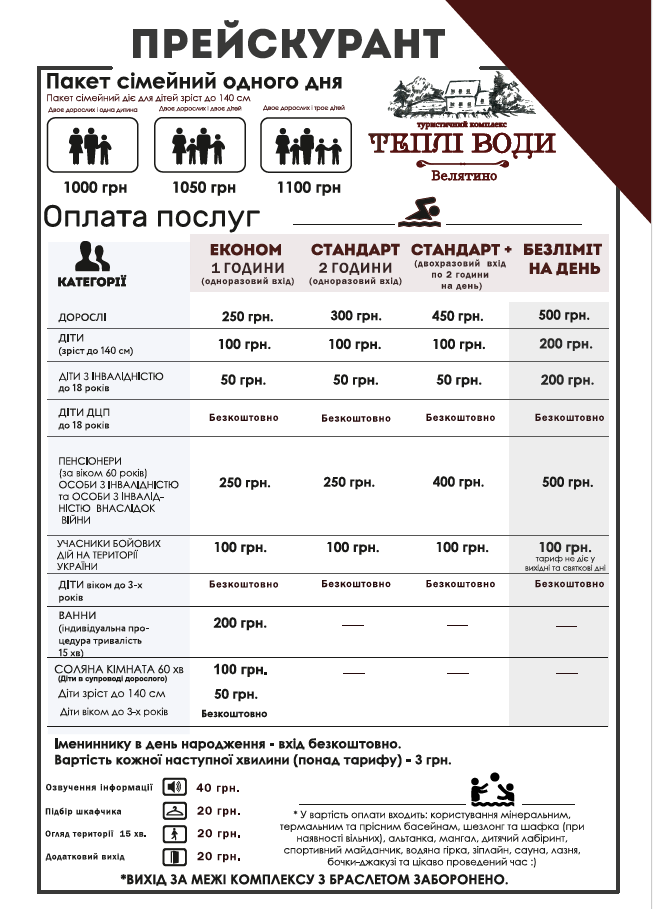 Ціни на термальні води Велятино – Теплі води на 2024 рік